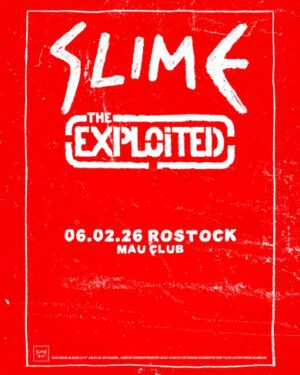 Wer bereits zu Lebzeiten so etwas wie Legendenstatus innehat, der wird meist schnell beim Mittagsschläfchen auf den eigenen Loorbeeren erwischt, oder bei großen Kneipentresen-Gesten zu den immer gleichen Stories von damals. Nicht so die 1979 gegründete Punkrock Institution Slime! Nach einem Jahr Kreativpause kommen Slime 2025 mit neuer Platte und Tour zurück. Am 1.8.2025 veröffentlichen sie die 13. Platte seit Bandgründung und die zweite mit Sänger Tex. Das viel erwartete Stück trägt den kryptischen Titel 3!+7(hocheins) und wird mal wieder für Überraschungen und Diskussionsstoff sorgen. Denn eins steht fest, Slime bleiben unberechenbar und erfinden sich in regelmäßigen Abständen neu. Die mittlerweile nicht mehr ganz neue Besetzung ist erfolgreicher als jemals zuvor. Viele neue Fans wurden dazu gewonnen und viele alte Fans die der Band im Laufe der Jahre den Rücken gekehrt hatten, sind seit dem letzten Album wieder zurück gekehrt.